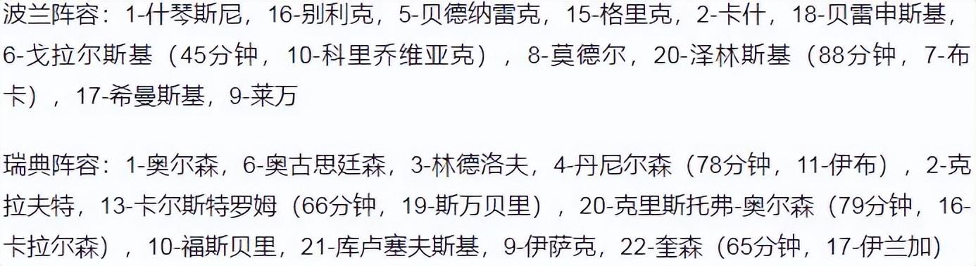 瑞典首发:1-罗宾-奥尔森、2-卢斯蒂格(67’16-克拉夫特)、3-林德洛夫、24-丹尼尔森、6-奥古斯丁森、7-塞巴斯蒂安・拉尔森、8-埃克达尔、10-福斯贝里(77’17-维克托・克拉森)、20-克里斯托弗·奥尔森、11-伊萨克(67’9-马库斯・贝里)、22-奎森(54’21-库卢塞夫斯基);
