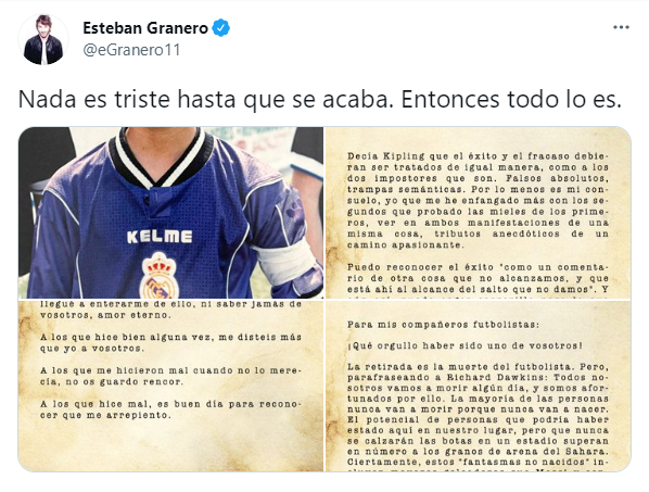 格拉内罗在社交媒体晒出自己在皇马青训时期的照片,发文宣布结束职业球员生涯。