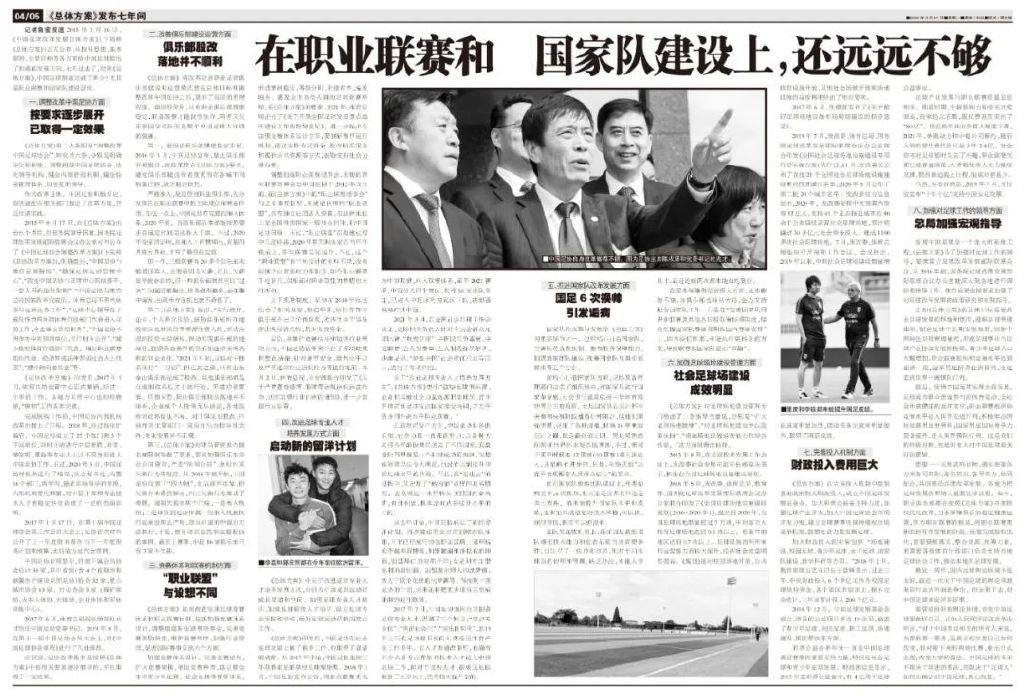 记者鲁蜜报道 2015年3月16日,《中国足球改革发展总体方案》(下简称《总体方案》)正式公布,从指导思想、基本原则、主要目标等各方面给中国足球指出了明确的发展方向,七年过去了,对照《总体方案》,中国足球到底完成了多少?尤其是职业联赛和国家队建设层面。