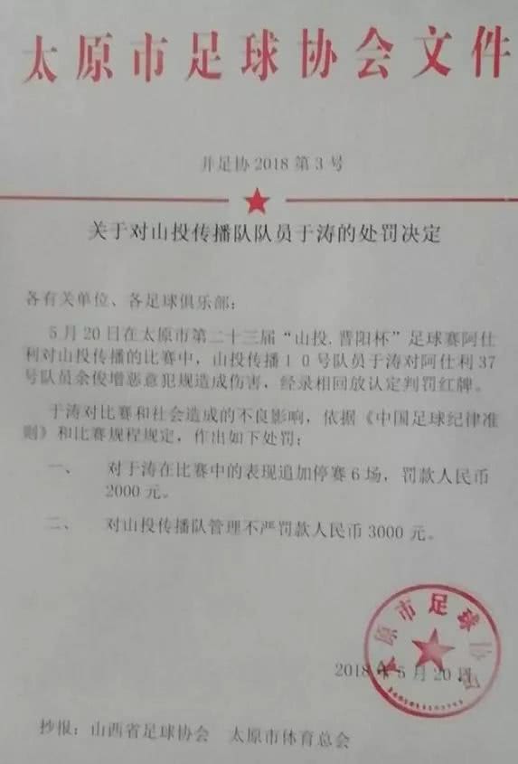 事后,主办方太原足协发布了《关于山投传播队队员于涛的处罚决定》,录像回放认定判罚红牌,追加处罚对犯规球员于涛停赛6场罚款2000元,对所在球队罚款3000元。
