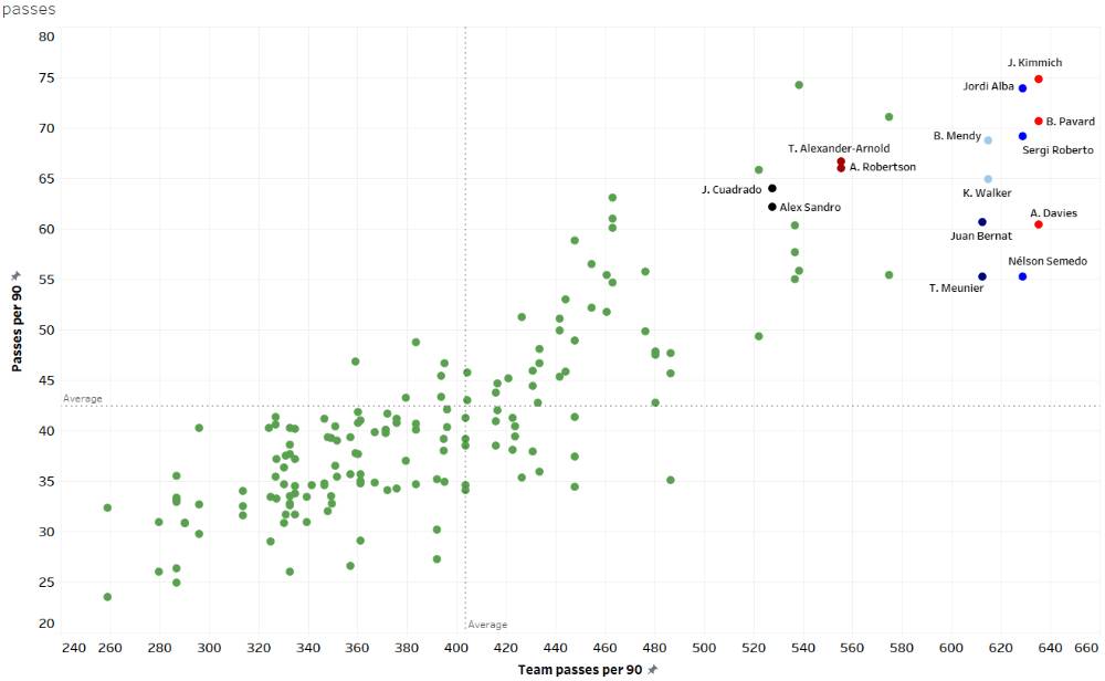 首先我们需要了解边后卫在球队控球战术中的重要性,所以来看看这些球队场均传球数以及边后卫的场均传递次数。在这个阶段,采用的都是每90分钟的场均数据,先来看下图。