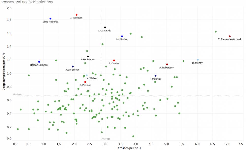 接下来我们再关注两个指标,它们会告诉大家边后卫在进攻三区如何活动以及他们在前场的表现。下图横坐标是场均传中次数,纵坐标则是场均深度传球(距离对方球门较近的传球)次数。