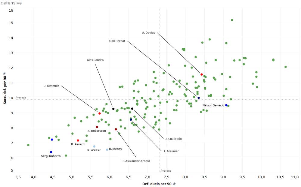 有一点需要指出的是阿方索-戴维斯、贝尔纳特还有塞梅多是仅有的3位防守数据在平均值之上的边卫。原因是他们的对手都将这些人防守的区域视为防守弱侧,进攻火力集中面对他们(比如戴维斯和贝尔纳特),而塞梅多和阿尔巴、罗贝托比起来确实是防守能力更为强悍。此外,曼城两名边后卫在一对一防守方面的表现着实很差。