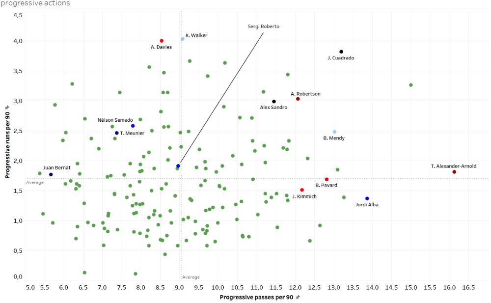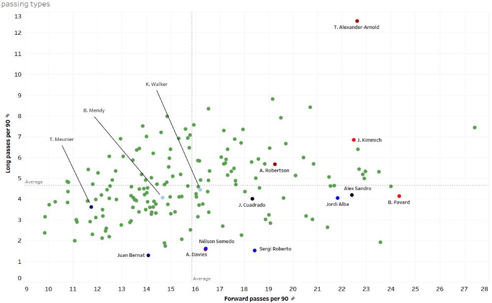 经过一番过滤之后一共有173名边后卫在考察范围之内,在图表中则是重点介绍了6家冠军俱乐部的边后卫,利物浦的阿诺德&罗伯逊;曼城的本杰明-门迪&沃克;尤文图斯的桑德罗&夸德拉多;PSG的贝尔纳特&穆尼耶;巴萨的阿尔巴&罗贝托&塞梅多;拜仁的基米西&帕瓦尔&阿方索-戴维斯,同样这些都是本赛季出场时间超过1015分钟的球员。接下来我们通过几个技术统计来看看是否能从指标上读出他们的不同作用。
