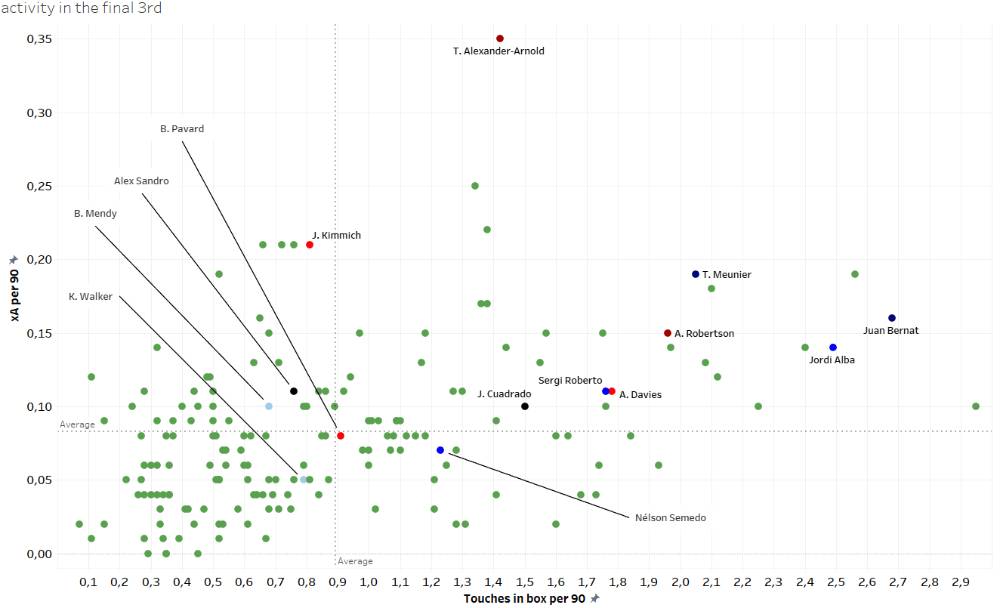 通过前文的讲述我们已经大致了解不同边后卫在各自俱乐部的作用了,也简单的说了一下不同战术打法中边后卫的表现区别。现在我们最后再来看两张图和四项统计。下图的两个指标是球员在进攻三区和禁区内的活动情况,横坐标是场均在禁区内的触球次数,纵坐标则是期望助攻值(xA)。