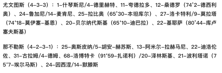 那不勒斯阵容:25-奥斯皮纳;22-迪洛伦佐、44-马诺拉斯、26-库利巴利、6-马里奥-鲁伊(89’ 2-马尔库特);8-法比安-鲁伊斯、99-安古伊萨;21-波利塔诺(71’ 11-洛萨诺)、7-埃尔玛斯(45’ 33-欧纳斯)、24-因西涅(72’ 20-泽林斯基);9-奥斯梅恩(89’ 37-佩塔尼亚)