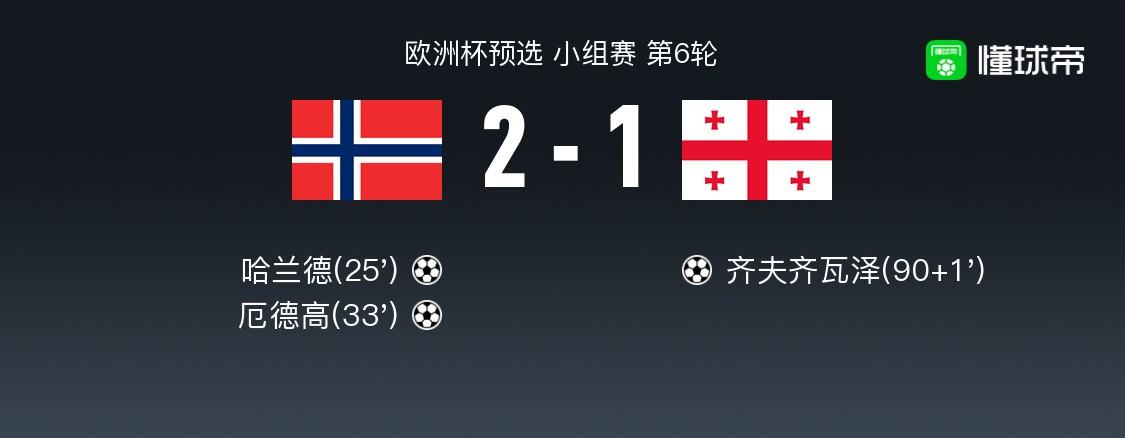北京时间9月13日欧洲杯预选 小组赛 第6轮,挪威主场对阵格鲁吉亚。挪威哈兰德破门,厄德高破门。格鲁吉亚齐夫齐瓦泽破门。最终比分2- 1。