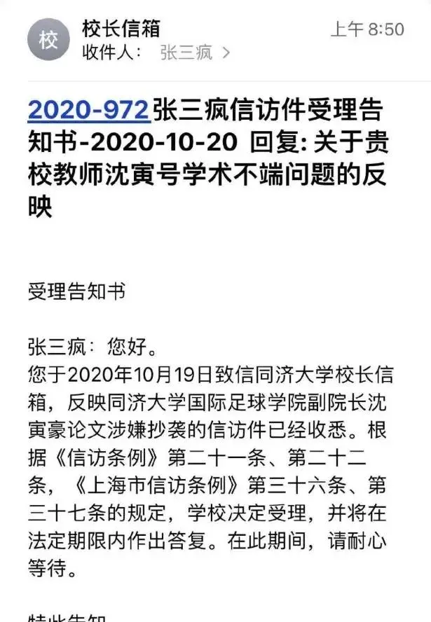 俱乐部投诉无果之下,愤怒的山东球迷挖出了其硕士学位论文以及学术期刊抄袭一事,重复率更是高达79.6%,在球迷匿名举报之下,当时身为同济大学国际足球学院副院长的沈寅豪被学校召回,并且同济大学正面回应表示决定受理作出答复。在外界看来,这一事件的产生不仅会令沈寅豪收到工作单位的严厉处罚,在中国足球层面其国际级裁判的身份也会不保。