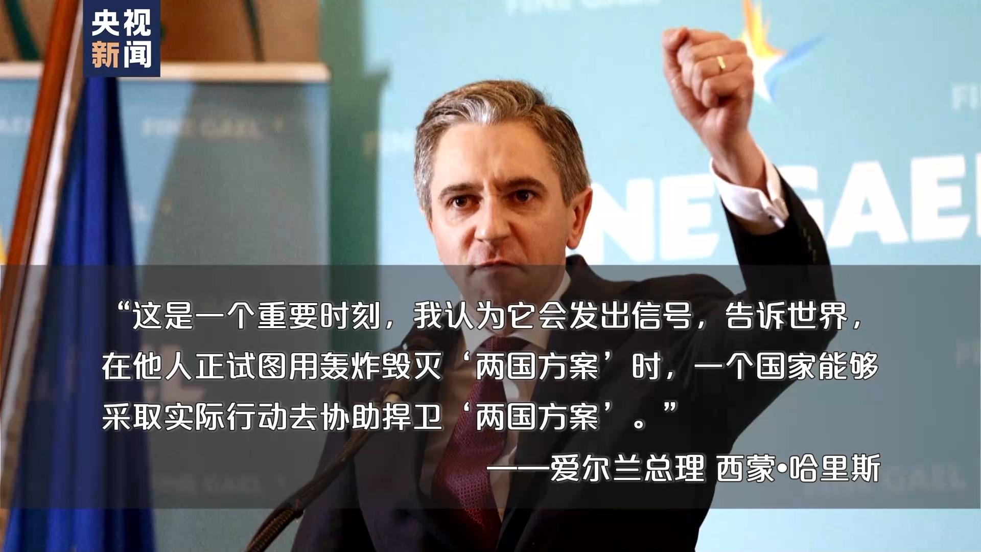 爱尔兰总理 西蒙·哈里斯: 我们说过承认巴勒斯坦国的时刻越来越近了,现在这一时刻终于到了。这对爱尔兰和巴勒斯坦来说都是历史性的一天,重要的一天。