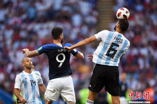 俄罗斯世界杯1/8决赛,法国4:3战胜阿根廷。图为双方球员争顶。 中新社记者 田博川 摄