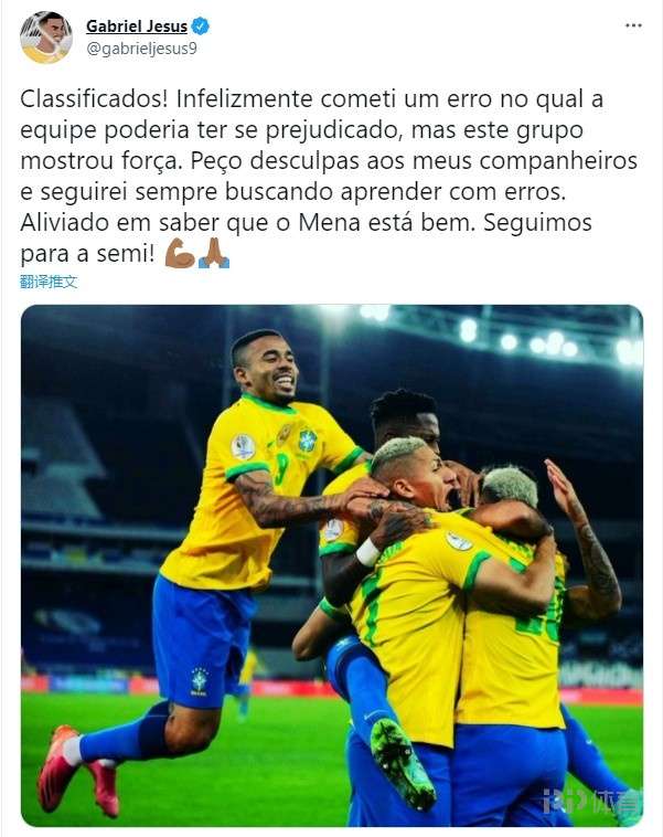 北京时间7月3日消息,今晨美洲杯1/4决赛上,巴西凭借着帕奎塔的制胜球1-0战胜智利,成功晋级半决赛。在本场比赛的下半时,热苏斯抬脚太高踢在梅纳脸上,被主裁判直接红牌罚下,致使巴西队在接下来的比赛过程中一直是10人应战。赛后,热苏斯在个人社交平台向梅纳致歉。