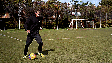 然后我们要第二次触球,用惯用脚的外侧,我要向相反的方向触球,爆发突破。我们要尽量减少两次触球之间的时间,为了做到这一点,我们要练习触球穿过身体,然后把球踢出去,确保我们一直把球放在我们的前面。