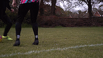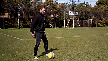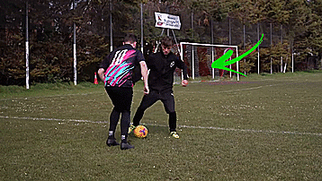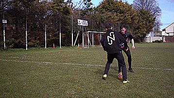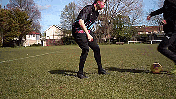 最后一步显然是切球,我们用惯用脚触球踩单车,现在用弱势脚的脚内侧把球切回来,这样我们就可以得到穿裆了。
