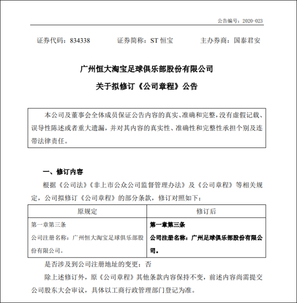 公告称,根据《中国足球改革发展总体方案》及《中国足球协会职业俱乐部准入规程》 的规定,广州恒大淘宝足球俱乐部股份有限公司需变更为非企业化的名称。公司拟变更为“广州足球俱乐部股份有限公司”。 并对《公司章程》中涉及公司名称的信息同时进行变更,具体以工商行政管理部门登记为准。