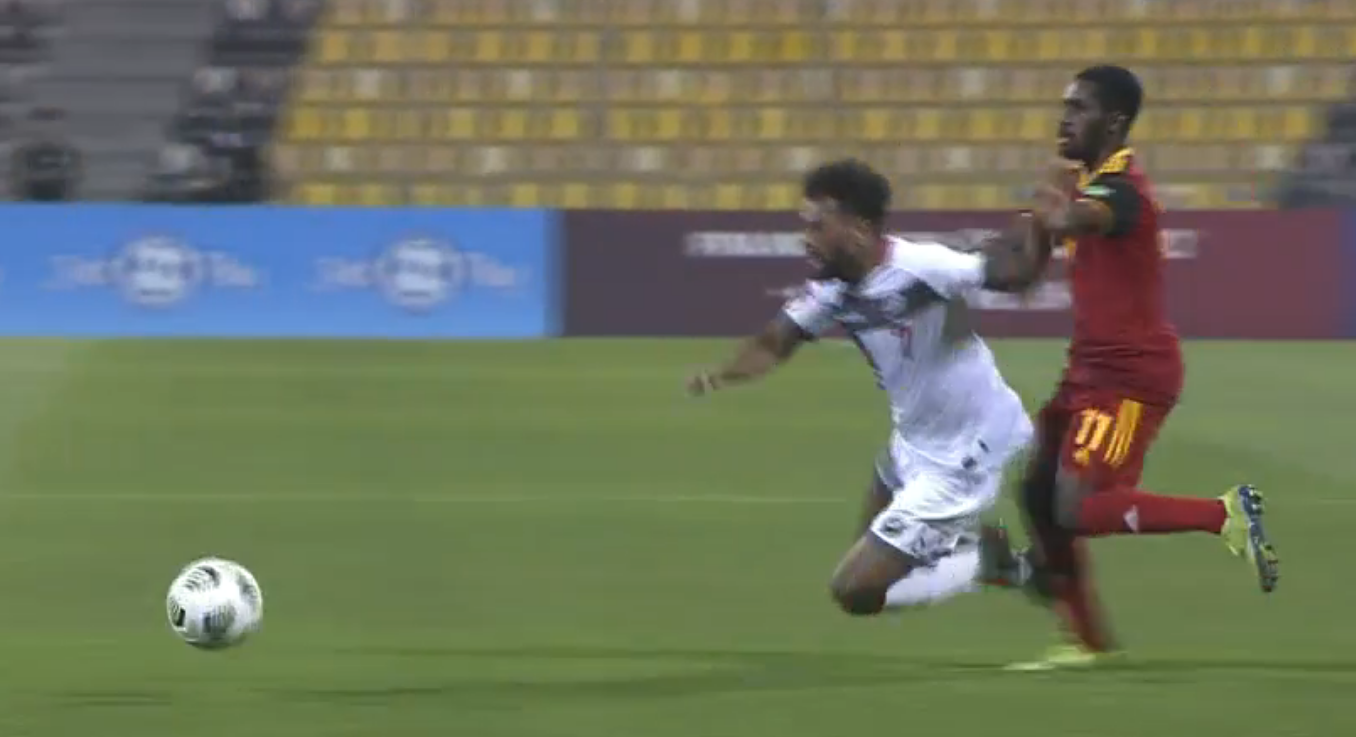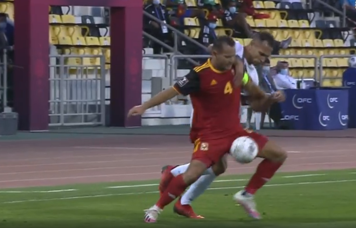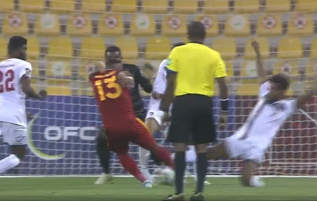 第76分钟,巴布亚新几内亚队在自家禁区人防守时,队友将皮球踢到了胳膊肘上,裁判员并没有任何表示。对此,新喀里多尼亚队员表达了强烈的不满。这次判罚令新喀里多尼亚队员心态明显崩溃最终在第88分钟做出了一个凶狠的抢断,而这一次没有逃过裁判员的眼睛,被红牌罚下。