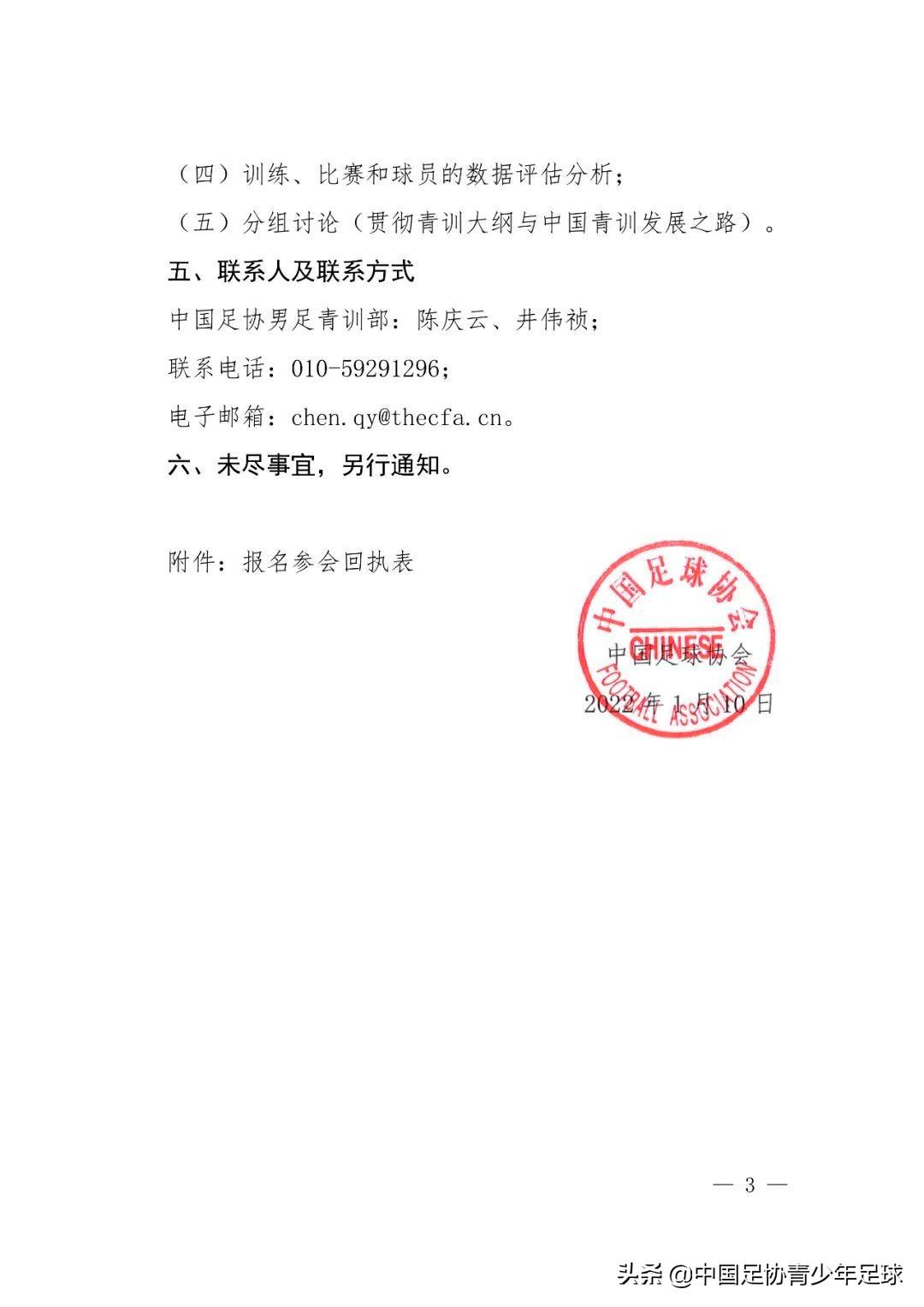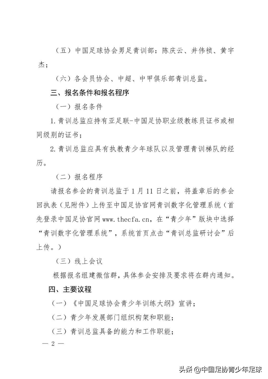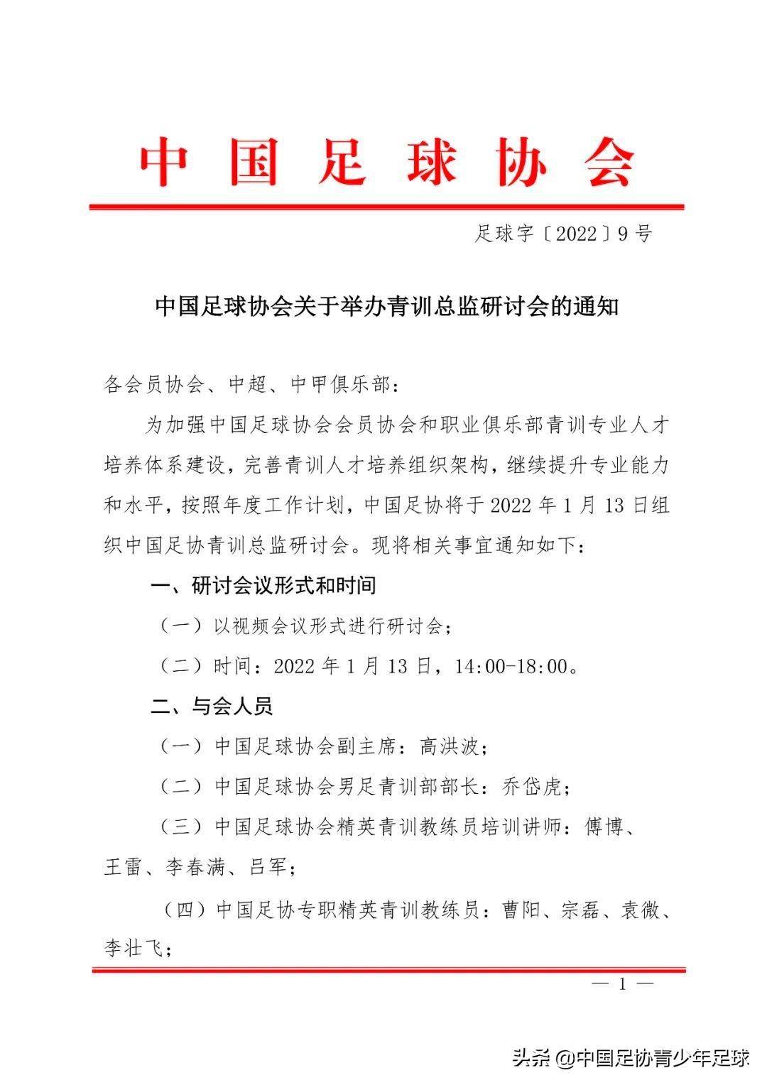 为加强中国足球协会会员协会和职业俱乐部青训专业人才培养体系建设,完善青训人才培养组织架构,继续提升专业能力和水平,按照年度工作计划,中国足协将于2022年1月13日组织中国足协青训总监研讨会。现将相关事宜通知如下: