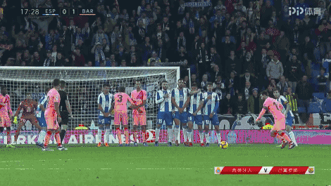 第16分钟,梅西禁区弧顶任意球射门,皮球直挂球门右上死角,巴萨1-0。