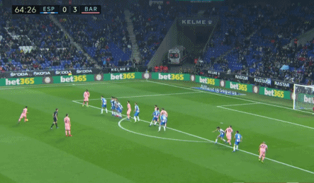 第65分钟,梅西禁区弧左侧任意球射门,皮球直挂球门左上角,4-0。