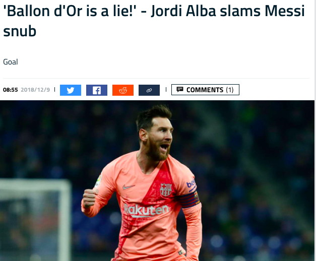 在巴萨客场4-0大胜西班牙人后,阿尔巴表达了对金球奖评选排名的质疑:“金球奖就是一个谎言,太多的俱乐部和媒体围绕着金球奖做文章了。人人都知道梅西是世界上最好的球员。在很多赛事中有很多球员确实表现出色,他们配得上获得殊荣,但总之这是一个颁给最佳球员的奖项,不是给冠军的,冠军是由球队取得的。”