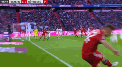第9分钟,基米希左侧角球传入禁区,莱万中路跃起甩头攻门,皮球飞入球门,拜仁1-0。