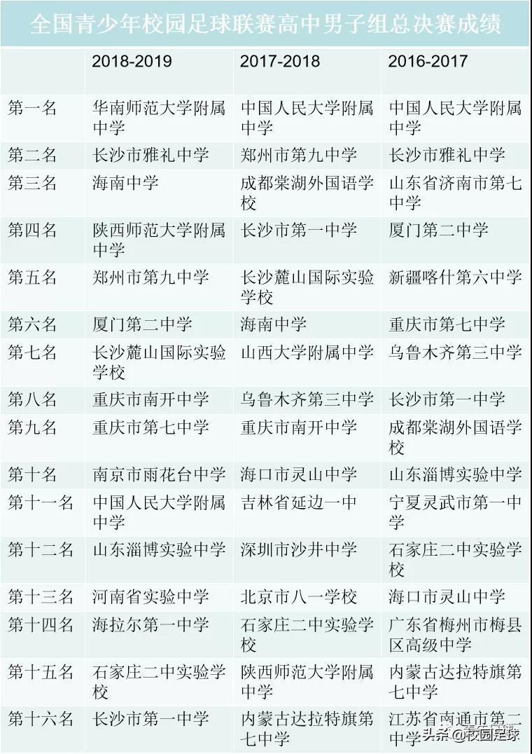 2019年6月13日,2018-2019全国青少年校园足球联赛高中组总决赛在滨州举行,16支球队参赛,最终排名如下: