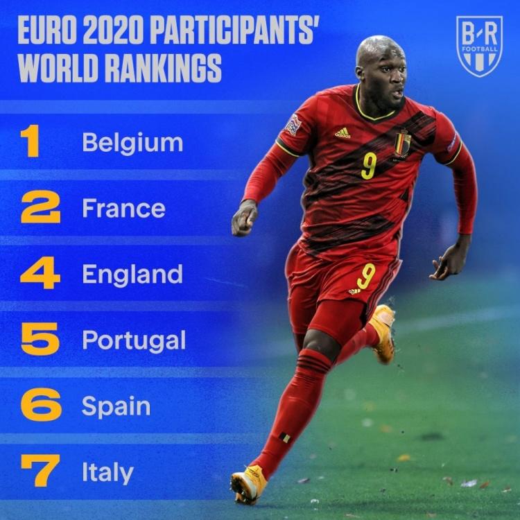 直播吧6月4日讯 欧洲杯已经近在眼前,外媒也统计了各队当前的世界排名,比利时力压法国居首,英葡西意分列4到7位,德国排在第12位。