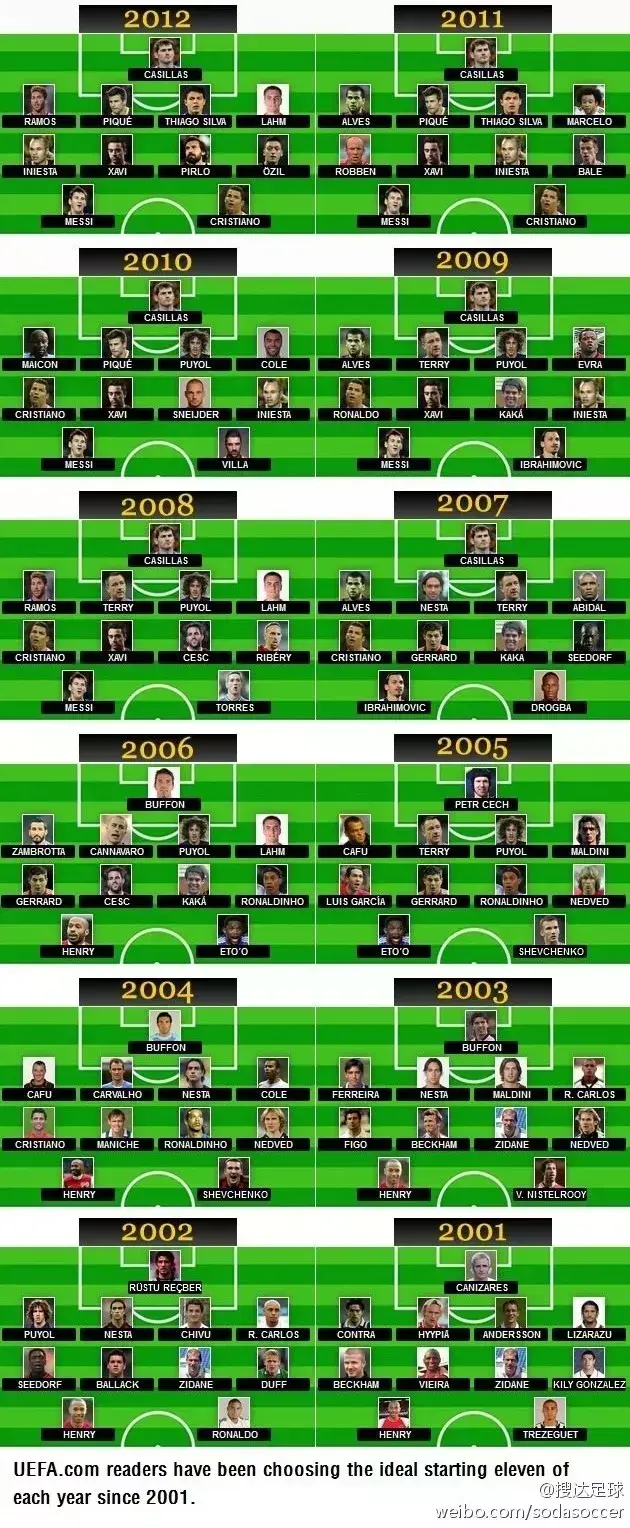 北京时间1月11日晚间,欧足联官方公布了2017年最佳阵容。2017年欧冠冠军得主皇家德里无疑仍是最大赢家,在11人阵容中共有5人来自皇马。具体阵容如下: