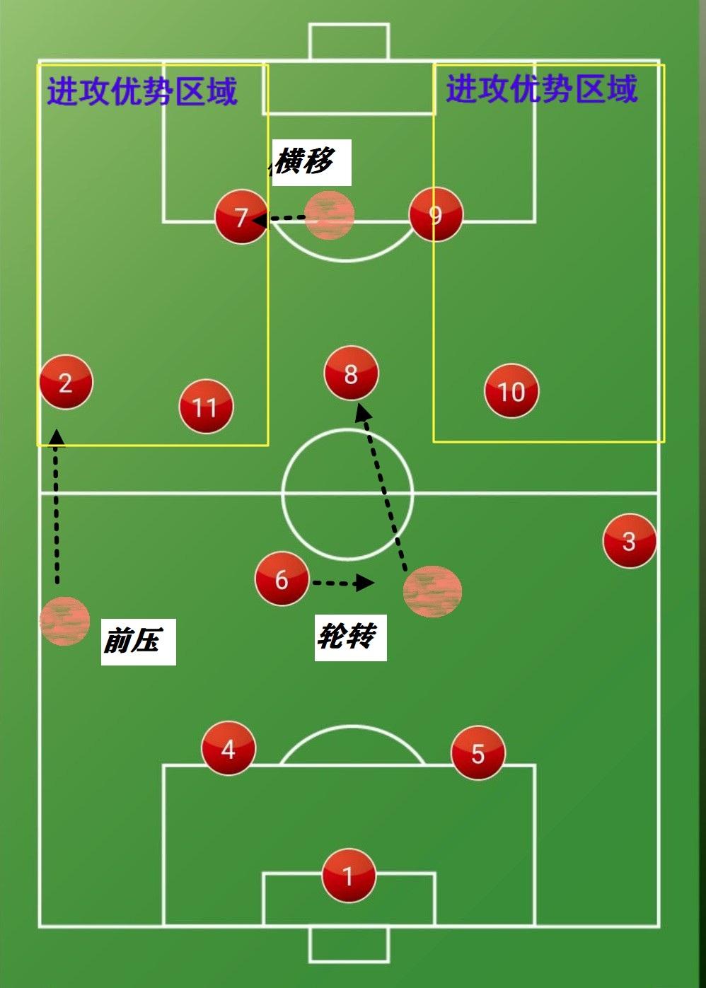 如下图所示,此时球队的阵型转换为4-2-3-1阵型,双后腰8号与6号位置不变,7号与11号两名进攻型中场充分拉开占据球场的宽度,保护此套阵型最为薄弱的边路,同时锋线上的一名球员10号,深度回防,落到前腰位置,填补中路的空缺。