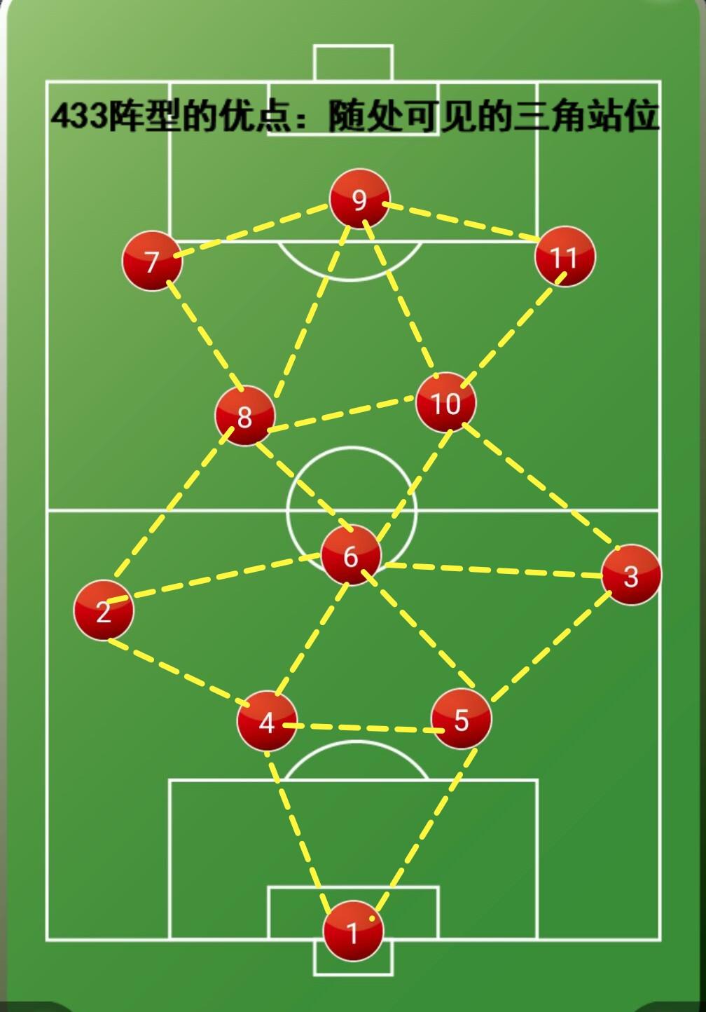 如下图所示,将4-3-3阵型里的每一位球员用线连起来,我们就可以发现,在4-3-3阵型里,任何一位球员与他相邻的两个球员之间都可以形成三角站位。那么形成三角站位,在现实的比赛中有什么用呢?球员处于三角网络中,在得到球后,可选的传球点较多(从平面阵型图来看,可供每个球员传球的点至少有两个),出球路线丰富了,球员之间的传球配合也就相更加灵活。