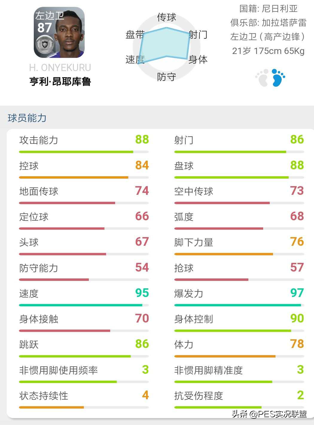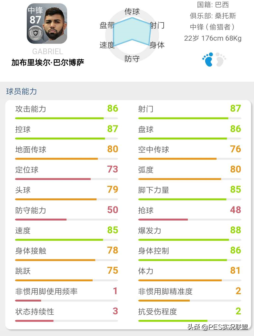 有“新内马尔”之称的巴西96级新星巴尔博萨一出道便被寄予厚望,更在16年巴西本土举行的奥运会足球比赛上打出了惊艳的表现。也正因为如此在2016年意大利豪门国际米兰以将近3000万欧元的价格将巴尔博萨收入麾下。不过由于桀骜不驯的性格,导致其在国米没有得到太多机会,如今被国米送回母队桑托斯的巴尔博萨,再次找回了天赋,因此实况中的数据也根据现实情况获得了增长,新引擎中最为重要的攻击、盘球、爆发、身体控制等数据都在平均水准之上,综合能力非常强悍。