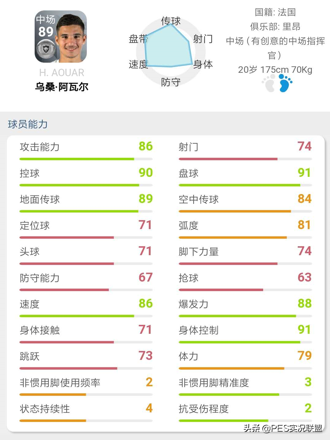 作为法国最好的球员青训和加工厂,法甲豪门里昂一贯盛产青年才俊,阿瓦尔就是最新的代表。不经常关注法甲的玩家可能不知道,这名长相俊朗,球风潇洒的小伙子得到过瓜迪奥拉的点名赞赏,而齐达内更是认为他是姆巴佩之外最优秀的年轻球员。游戏中的数据也很好地反映了他现实中的踢球风格,86的攻击能力前插跑位非常积极,90的控球91的盘球,再加上91的灵活和中场球员里出众的速度,可以轻松完成持球推进。