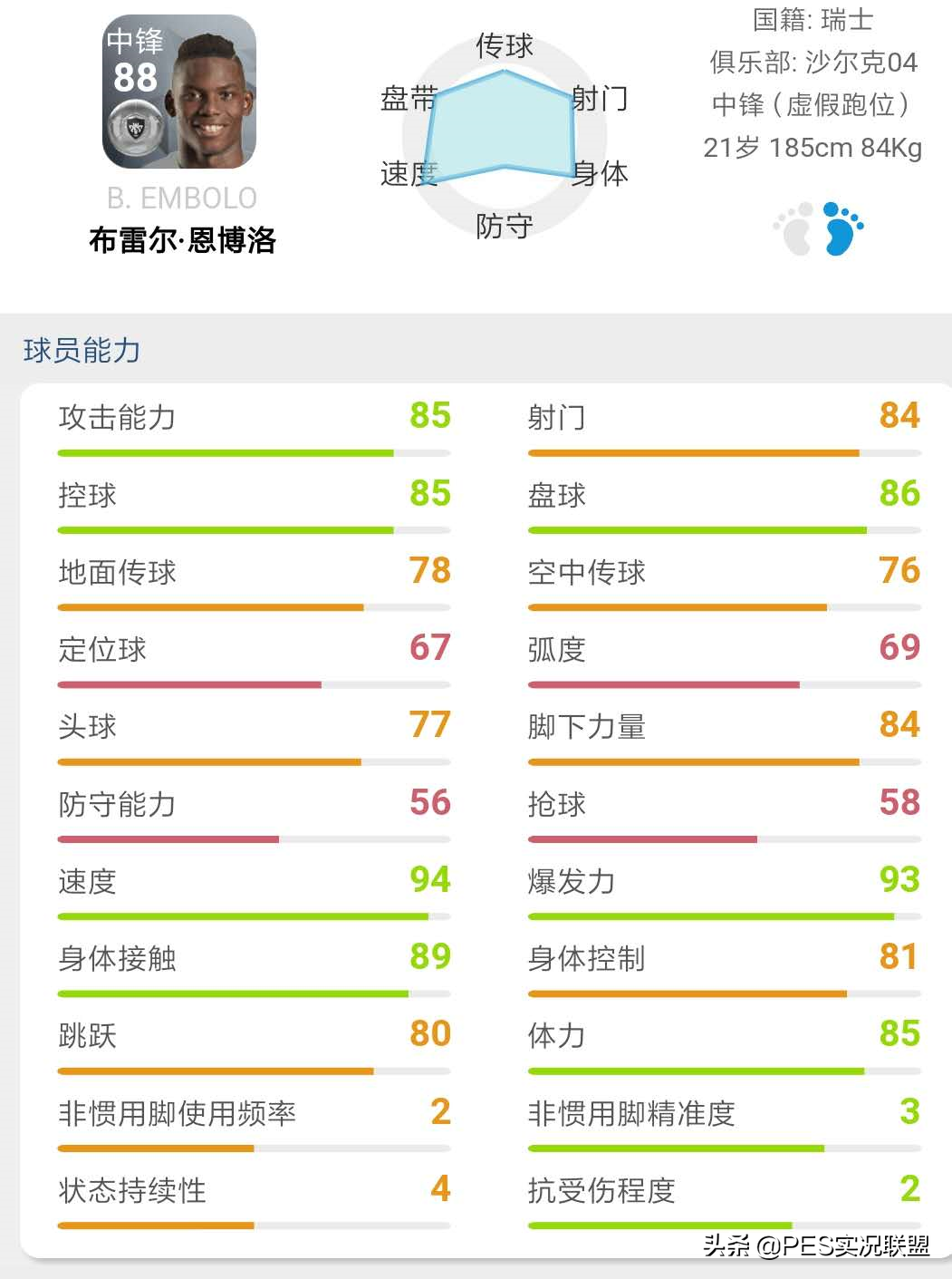 恩博洛无论在现实中还是游戏里,都是名副其实的妖人。他17岁便在巴塞尔一线队踢上了主力,成为了欧洲足坛红极一时的“小妖”,在2016年,德甲的沙尔克04选择了花费2000万欧元加上浮动条款的价格买下了这名瑞士新星,而他的转会身价也是当时沙尔克04的队史第一。游戏中的恩博洛拥有不俗的身体对抗能力,93的速度和94的爆发力在中锋球员中首屈一指,再加上过硬的盘控和跑位,非常好用。