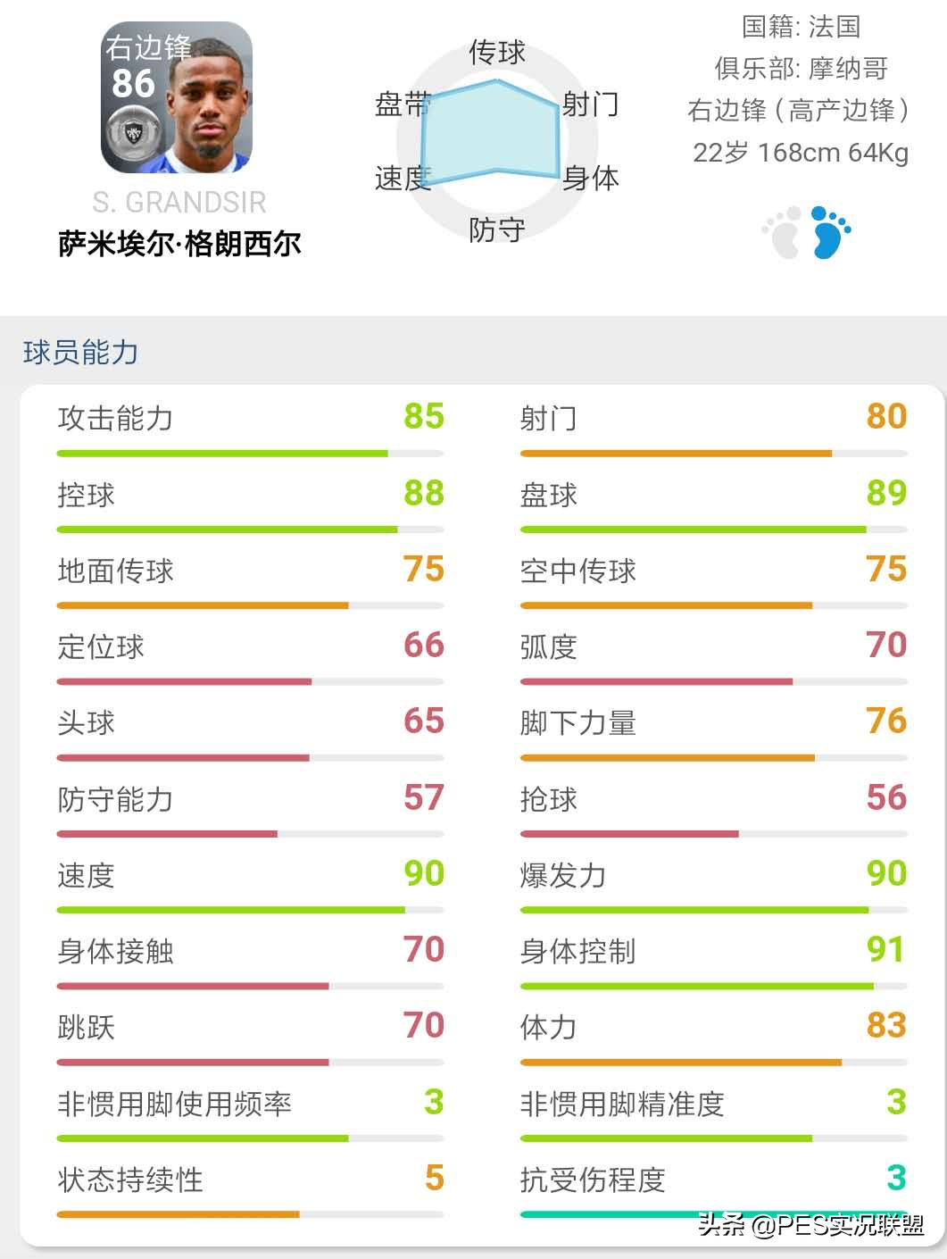 现年只有21岁的格朗西尔在2012年加入了特鲁瓦青训,此后他在2016年升上了一线队。这位法国U21国脚在本赛季的法甲联赛出场了36次,打进3球,并送出5次助攻,此外他分别在法国杯和法国联赛杯出场3次和1次。作为欧洲足坛新晋涌现的潜力股,格朗希尔在游戏中的数据非常出色,双速90配、91的灵活,外加88的控球、89的盘球,完全可以撑起一条边路进攻。