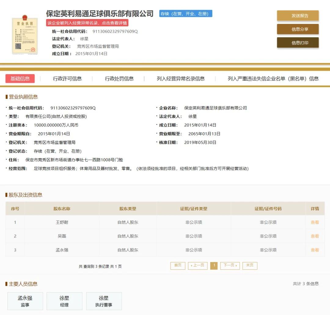 ▲保定英利易通足球俱乐部有限公司被列入经营异常名录