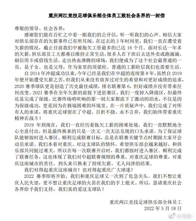 据多家媒体消息,18日傍晚,重庆队球员冯劲在微博上发布了重庆两江竞技全体员工的讨薪信。