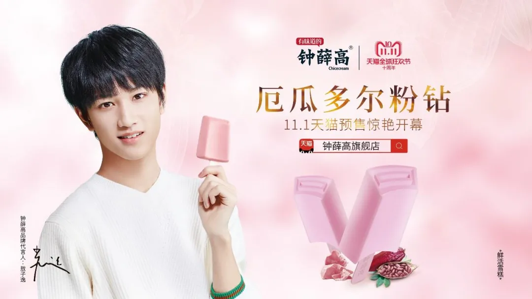 2018年双十一,钟薛高在线上推了一款“厄瓜多尔粉钻雪糕”。据称,用了世界上独一无二的天然粉色可可,原料稀缺,成本高昂(近40元/支),天猫售价66元。不到10小时,2万片全部售謦。