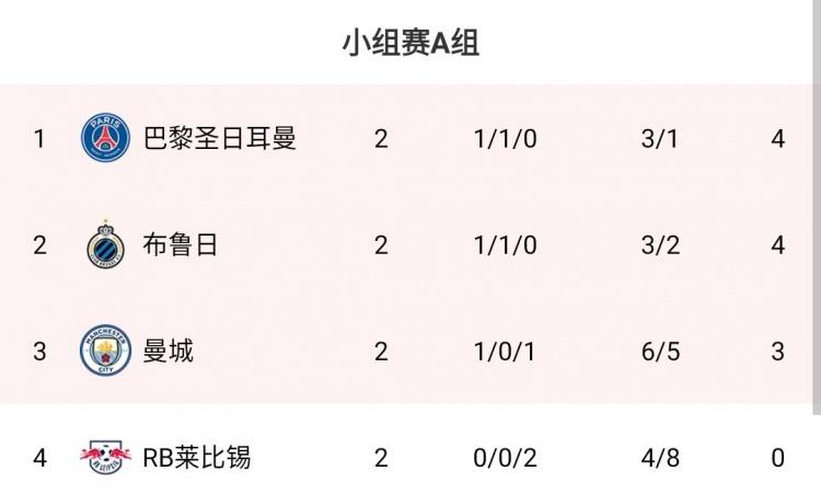 巴黎与布鲁日均是1胜1平,分列前二;曼城1胜1负排第三,莱比锡两连败垫底。