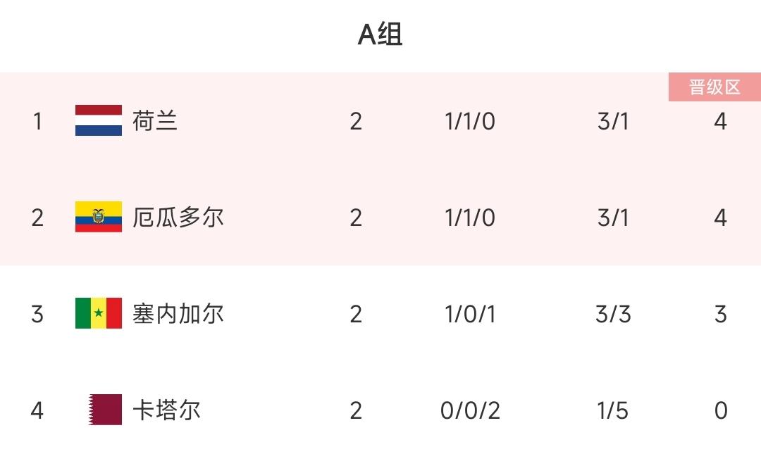 比赛上半场第44分钟:塞内加尔凭借点球1-0领先厄瓜多尔,在积分榜上也反超了厄瓜多尔,升至A组第二!