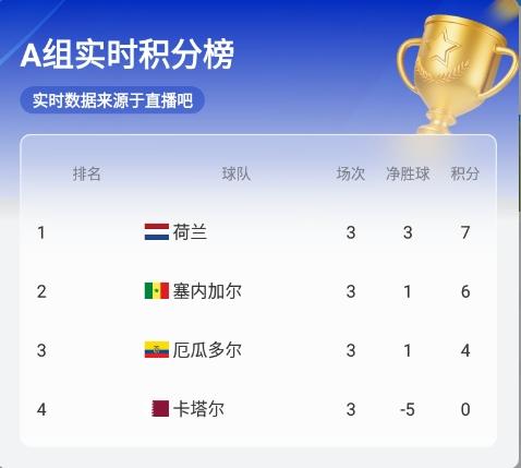 直播吧11月29日讯 世界杯小组赛A组第三轮比赛——荷兰vs卡塔尔、厄瓜多尔vs塞内加尔的比赛正在进行当中。