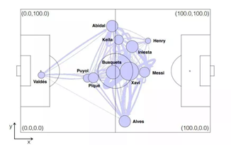 球赛中最常听到的数字就是控球率,大多数情况下控球多的被认为是强队,所谓控球,就是足球在同一队的队友之间传递,由此便产生了传球网络。2019年9月 Scientific Reports 上发表的一篇论文,该研究对巴萨10-11赛季比赛的传球网络进行了可视化:代表球员的点越大,参与传球次数越多;连边越粗,说明两人间传球配合越密切。