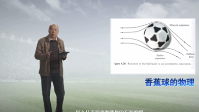 贝克汉姆最擅长的香蕉球是怎么踢出来的?有什么物理原理?按照葛惟昆《足球与科学》讲座的观点,香蕉球就是一种旋转球,球在运动中发生偏转,再拐进球门。空气脱离开球,上部晚一点,下部早一点,所以整个流动会向下面倾斜。这种技术很刁钻,那么如何踢,用脚的哪个部分踢,有什么讲究?“香蕉球可以用脚弓也可以用脚背踢,它的关键是脚与球要有长时间的接触。”