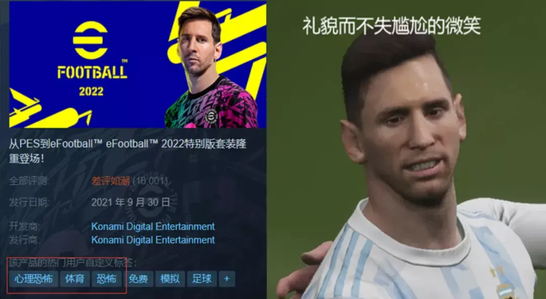自9月30日上架以来,实况2022已在Steam上收获超过15000个差评,好评率一度不足8%,荣膺目前Steam的“差评之王”。玩家们还给游戏打上了“心理恐怖”的标签,恨不能向开发商科乐美(Konami)要求精神赔偿。