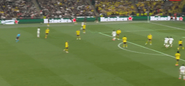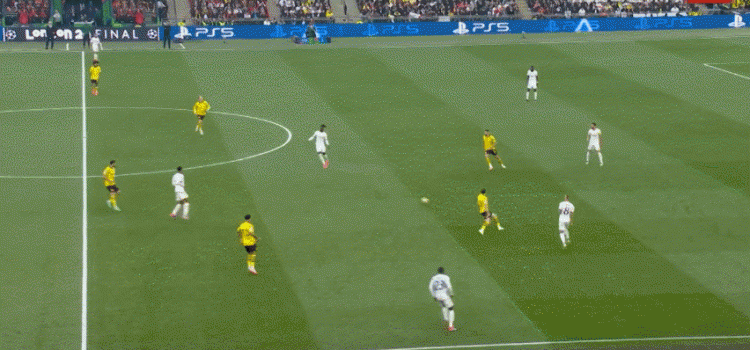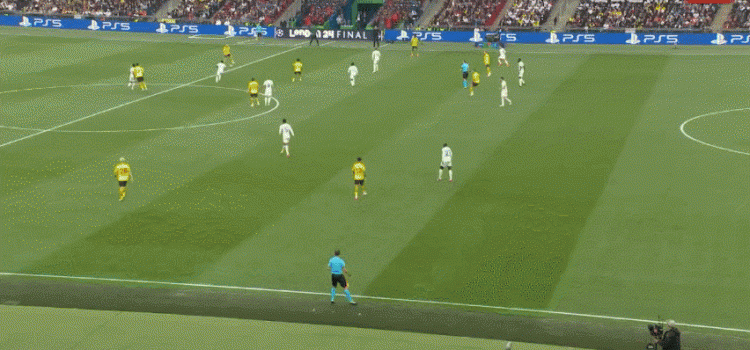 由于皇马的锋线配置存在明显缺陷,多特蒙德此役的运动战防守质量较之半决赛阶段更为出色。得益于桑乔和阿德耶米的积极回防,瑞尔森和马特森可以在单兵防守时表现出更强的侵略性,胡梅尔斯和施特洛贝克的协防完全切断了皇马的边中连接通道。己方的后场肋部不但没有出现明显漏洞,反而成为了反击策源地,除了继续依靠胡梅尔斯—阿德耶米连线,多特蒙德还频繁采用打身后的方式将菲尔克鲁格送入射程,此举避免了与皇马进行中场缠斗,发挥出了黄黑锋线冲击力较强的优势。
