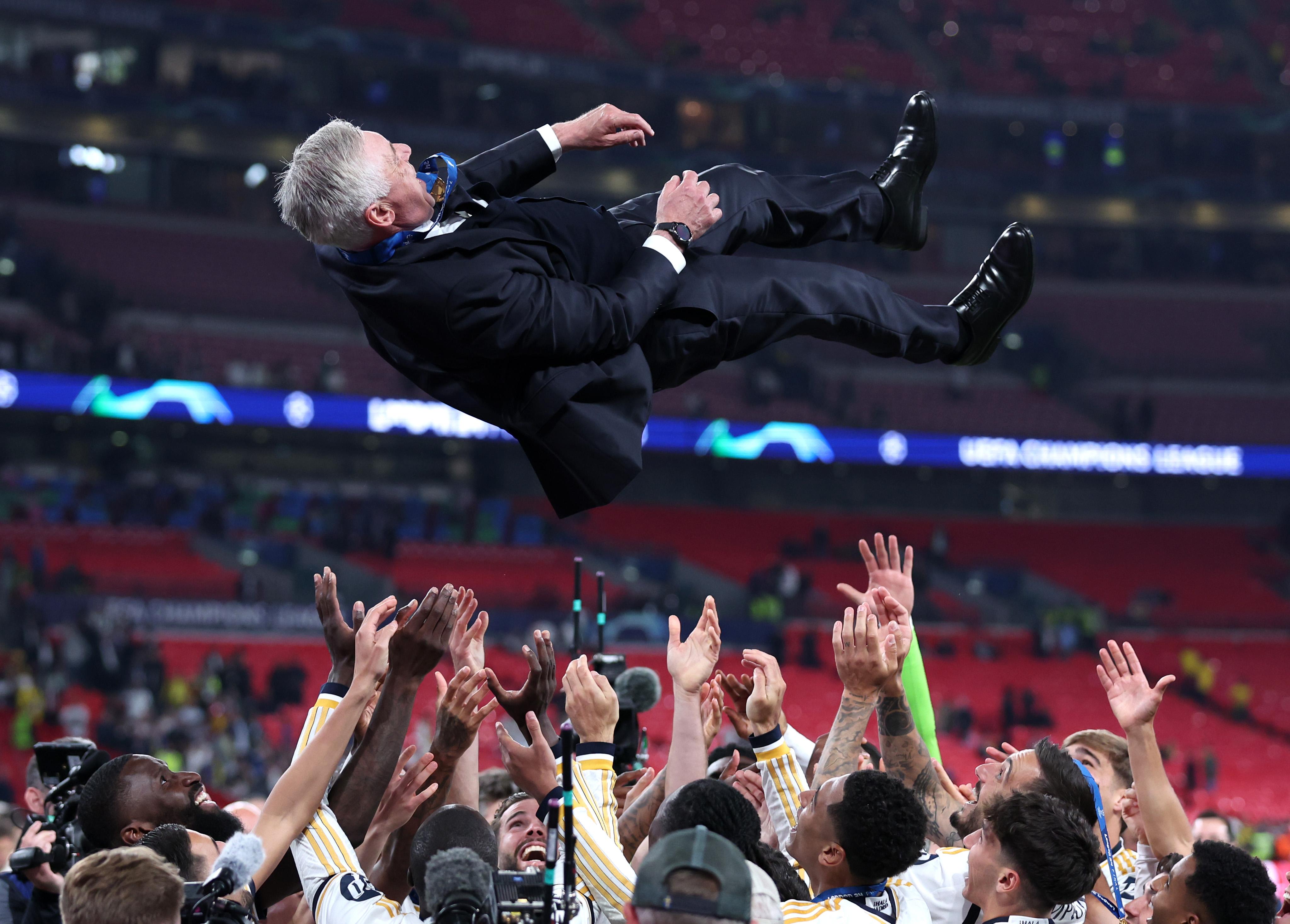6月1日,皇家马德里队球员赛后抛起主教练安切洛蒂。 新华社发