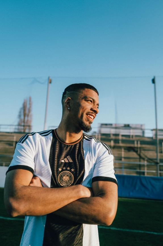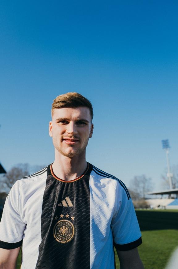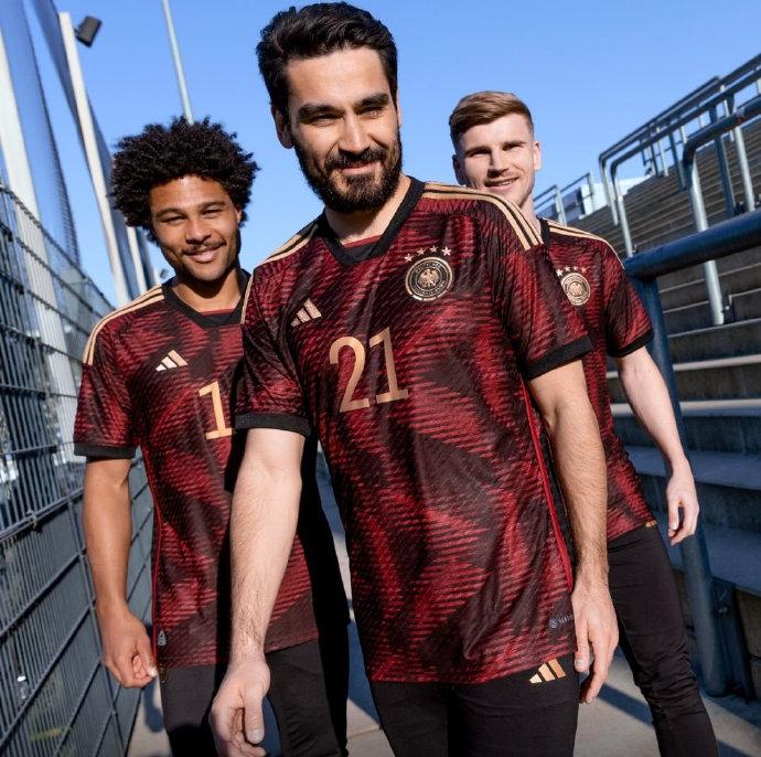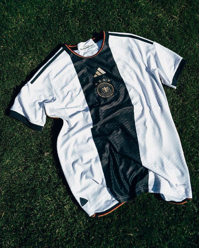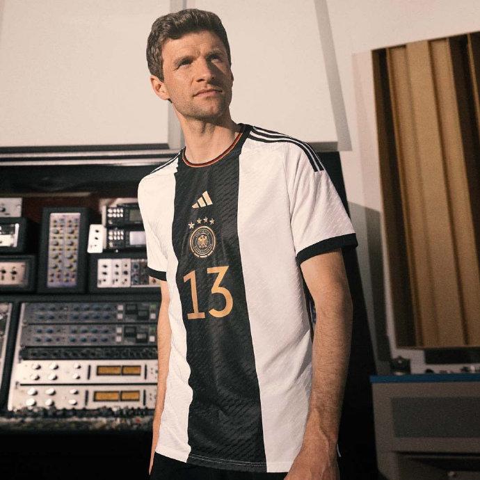 直播吧8月29日讯 德国国家队世界杯球衣今日上身照出炉。主场球衣是白色搭配中间的深色条纹,客场则是黑红色纹理。