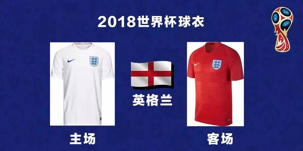 英格兰国家队全系服装以白、红、蓝为主色调,既英格兰的传统“三原色”。白衣蓝裤是英格兰队服的传统搭配,而细节之处的红色点缀则是点睛之笔。现代感十足的衣领、后侧的圣乔治十字旗、胸前的蓝色耐克Swoosh标识以及著名的“三狮”队徽恰好拼凑出英格兰传统的色彩。