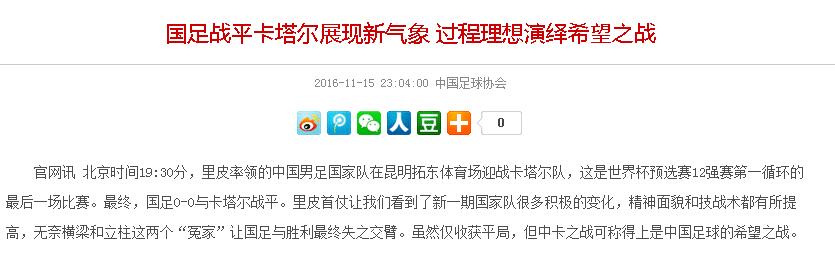 北京时间19:30分,里皮率领的中国男足国家队在昆明拓东体育场迎战卡塔尔队,这是世界杯预选赛12强赛第一循环的最后一场比赛。最终,国足0-0与卡塔尔战平。里皮首仗让我们看到了新一期国家队很多积极的变化,精神面貌和技战术都有所提高,无奈横梁和立柱这两个“冤家”让国足与胜利最终失之交臂。虽然仅收获平局,但中卡之战可称得上是中国足球的希望之战。