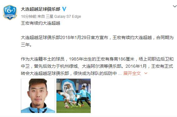 直播吧1月29日讯 中甲俱乐部大连超越官方宣布,球队续约王宏有,合同期为三年。