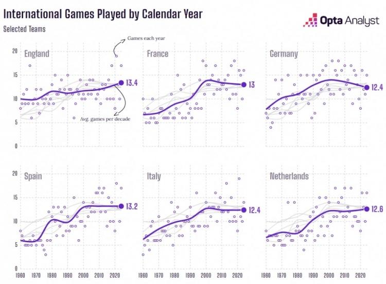 自上世纪六十年代以来的每个10年,英格兰、法国、德国、西班牙、意大利和荷兰平均每年的比赛数量都在稳步增加。就西班牙和意大利而言,他们每年的平均比赛数量从6场增加到了12场,翻了一倍。