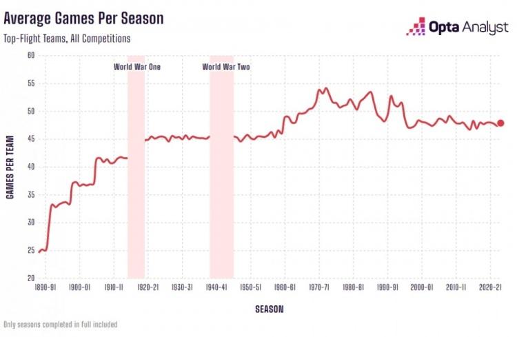 但在九十年代初英超联赛诞生之后,比赛场次的总体趋势是下降的。自英超球队数量从22支减少到20支之后,顶级联赛球队的平均比赛场次从未超过50场。
